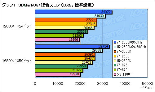 基礎検証レポートで,その性能にはかなりの期待が持てそうであると判明しているSandy Bridgeだが,実際のゲームアプリケーションで,従来のCPUよりどの程度速いのか。まずはグラフ1,「3DMark06」(Build 1.2.0)の総合スコアから見てみよう。