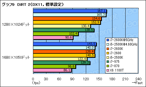 一方,グラフ9に示した「Colin McRae: DiRT 2」(以下,DiRT 2)では,これまでと若干異なる傾向が出た。DiRT 2では,i7-2600K&i7-2600とi5-2500Kのスコア差が14〜19%と大きく,さらにi5-2500Kがi7-975に逆転を許しているのだ。