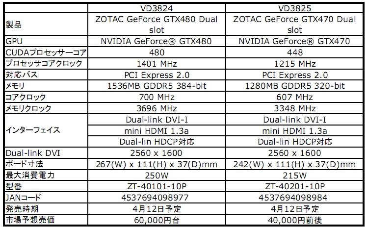 ZOTAC製の「GeForce GTX 480&470」カードが4月12日発売予定