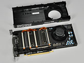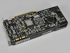 「カード全体を覆う」という点ではGTX 480と同じGPUクーラーだが,カード長が短くなった関係で,クーラーも小型化。GTX 480のリファレンスクーラーにあった,PCケース内へ廃熱するヒートスプレッダ機能がなくなったことで,見た目はだいぶおとなしくなった。