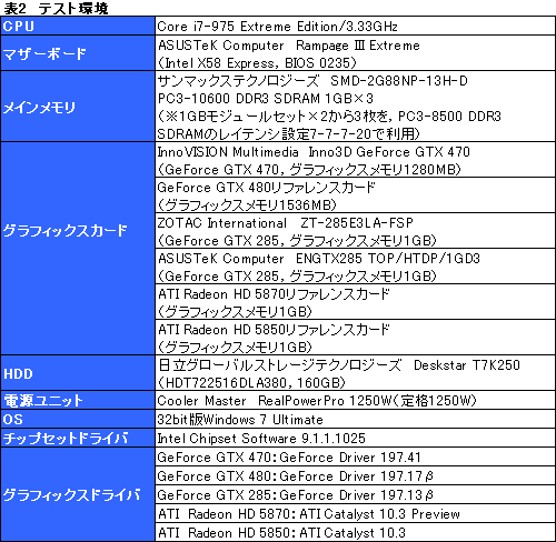もっとも,GTX 470のテストに用いた「GeForce Driver 197.41」は,GTX 480のレビュー時に用いた「GeForce Driver 197.17 Beta」のWHQL認証済み版という位置づけなので,両者のスコアを横並びで比較しても問題ないと思われる。「ATI Catalyst 10.3」と同プレビュー版も,おそらく大丈夫だろう。