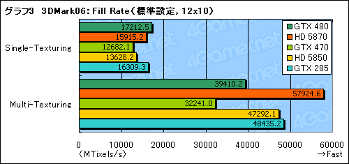 グラフ3は「Fill Rate」(フィルレート)だが,主にテクスチャユニット(やROPユニット)の性能が問われる本テストにおいては,GTX 480がそうであったように,GTX 470のスコアもまったくもって芳しくない。とくに,よりテクスチャユニット性能が問われる「Multi-Texturing」で,GTX 470が,HD 5850比で68%のスコアしか示せていないのは,DirectX 9世代のゲームパフォーマンスという観点から,気になるところといえる。