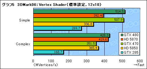 GF100では,DirectX 11(Direct3D 11)最適化の一環として頂点演算性能に手が入っているため,GTX 470の頂点シェーダ性能は高めに出ている。一方,ピクセルシェーダ性能はGTX 285の78%しか出ていない。これは,いくら何でもドライバの最適化不足だと思われるが,少なくとも現時点においては,DirectX 9世代のアプリケーションを実行するうえで懸念材料となりそうだ。