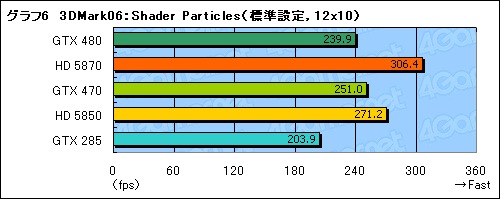 Shader Model 3世代における汎用演算性能を見る「Shader Particles」(シェーダパーティクル)や,長いシェーダプログラムの実行性能を見る「Perlin Noise」(パーリンノイズ)のテスト結果はグラフ6,7に示したとおり。ここでは,Shader Particlesで,GTX 480よりGTX 470のほうが高いスコアを示している点に注目したい。スペック的にはあり得ない事態であり,これは要するに,ドライバの練り込みがまだ相当に甘いということなのだろう。