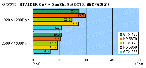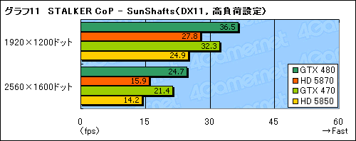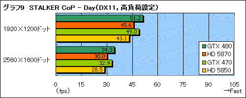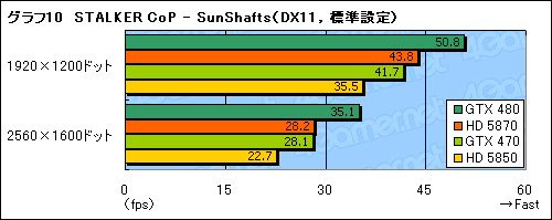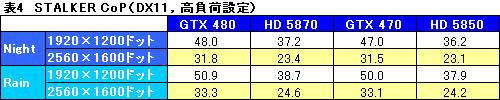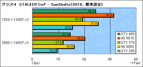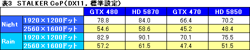 これもGTX 480のレビュー時にお断りしたとおりだが,STALKER CoPでは,「DX11 Ultra」および「DX10 High」の2モードでテストを行う。「Day」「Night」「Rain」「SunShafts」と四つ用意されるシークエンスのうち,グラフ化するのは最も描画負荷の低い「Day」と,逆に最も高い「SunShafts」で,残りは表で示すことにする。このほかテスト方法については,GTX 480のレビュー記事を併せてチェックしてもらえれば幸いだ。