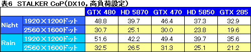 GTX 470のスコアは,対GTX 480で標準設定時に88〜89%,高負荷設定時に82〜83%。とはいえ,DirectX 9世代のゲームタイトルを前にしたときの優位性は,全体としてATI Radeon HD 5800シリーズのほうが上だ。高負荷設定だと,HD 5850と互角のレベルだが,今度はGTX 285とほとんど変わらないスコアしか示せていない点も気になってくる。