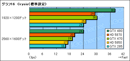 以降はレギュレーション9.0準拠のテストとなるが,まずグラフ16,17の「Crysis Warhead」は,DirectX 10世代のタイトルであるものの,もともとGeForceシリーズ有利ということもあって,標準設定では,GTX 470がHD 5870に迫る傾向を示した。