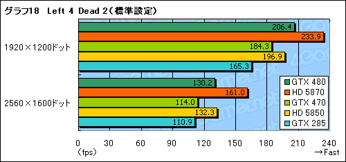 続いて,DirectX 9世代のFPS,「Left 4 Dead 2」のテスト結果がグラフ18,19となる。