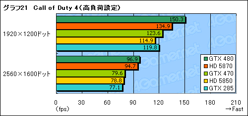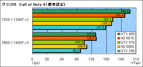 DirectX 9世代のFPS,二つめとなる「Call of Duty 4: Modern Warfare」(以下,Call of Duty 4,グラフ20,21)。Left 4 Dead 2と比べると,GeForce GTX 400シリーズが持ち直しているのだが,GTX 470とGTX 480の差は17〜18%と,最も大きなレベル。また,ここでもGTX 470は,GTX 285からの上積みがあまり見られない。