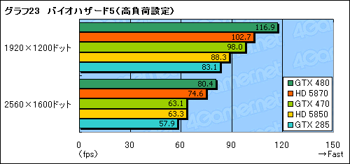 続いて,DirectX 10モードで実行した「バイオハザード5」のスコアをまとめたものがグラフ22,23となる。
