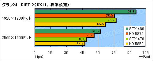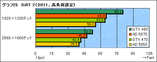 パフォーマンス検証の最後は,ATI Radeonに最適化されているDirectX 11世代のタイトル,「Colin McRae: DiRT 2」(以下,DiRT 2)。GTX 480のレビュー時と同様,DirectX 11モードでのスコアのみをグラフ24,25に示したが,GTX 470は,DirectX 11環境での強さを生かし,1920×1200ドット時に,HD 5870と互角の戦いを演じている。