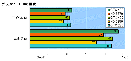 ところで,GTX 480は,リファレンスクーラーの搭載時に,GPU温度が90℃を超えていたが,この点で,カードが小型化しているGTX 470でどういった変化が生じたのだろうか。グラフ27は,3DMark06の30分間連続実行時を「高負荷時」として,アイドル時ともども,室温20℃の環境においたバラック状態で,GPU-ZからGPU温度の取得を試みた結果になる。