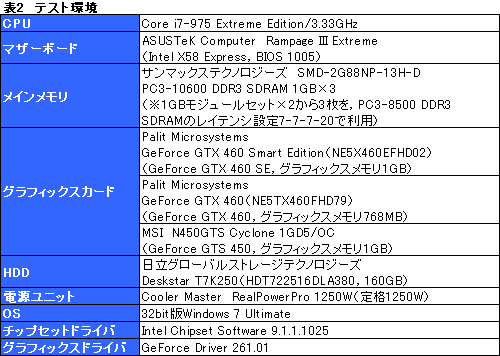 今回のテスト環境は表2のとおり。比較対象としては,同価格帯となるGTX 460 768MBから,先ほど紹介したGeForce GTX 460(NE5TX460FHD79),下位GPU「GeForce GTS 450」(以下,GTS 450)搭載モデルからはMSI製の「N450GTS Cyclone 1GD5/OC」をそれぞれ用意した。