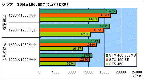 その結果をまとめたものがグラフ7だが,全体の傾向は3DMark06の総合スコアとよく似た印象だ。GTX 460 SEのスコアはGTX 460 768MBに届いていないものの,高負荷設定や高解像度ではその差が縮まっており,負荷の高まりに連れてグラフィックスメモリへの転送データ量が増大し,GTX 460 SEの持つメモリ周りの強みが出てきている,というわけである。