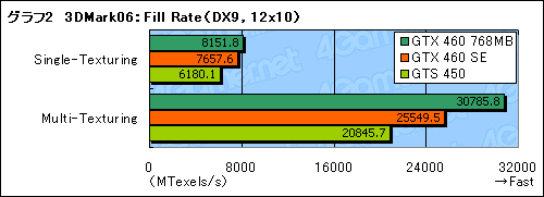 グラフ2に示した「Fill Rate」(フィルレート)を見てみると,CUDA Core数と動作クロックでともにGTX 460 768MBを下回るGTX 460 SEのスコアは順当に落ちている。「Multi-Texturing」で,GTX 460 768MBとGTS 450のほぼ中間というのは,VBIOSに刻まれたGeForce GTS 455という型番らしい結果といえるかもしれない。
