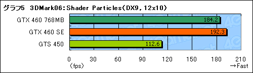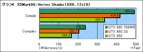 続いて,「Pixel Shader」(ピクセルシェーダ)と「Vertex Shader」(頂点シェーダ)のテスト結果をグラフ3,4で確認してみるが,ここでも,GTX 460 SEのスコアはGTX 460 768MBとGTS 450のほぼ中間といった位置に収まっている。GTX 460 SEという名称ながらも,GTX 460 768MBからのスコア低下はかなり大きい印象だ。
