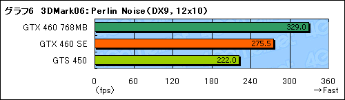 Shader Model 3世代における汎用演算のポテンシャルを見ることもあって,ピクセルシェーダとメモリ周りの性能がスコアを左右しやすい「Shader Particles」(シェーダパーティクル)だと,256bitメモリインタフェースに容量1GBのメモリインタフェースが奏功し,GTX 460 SEがGTX 460 768MBを逆転(グラフ5)。その一方,長いシェーダプログラムの実行性能を見る「Perlin Noise」(パーリンノイズ)の結果をまとめたグラフ6だとGTX 460 SEはGTX 460 768MBからスコアを大きく落とした。