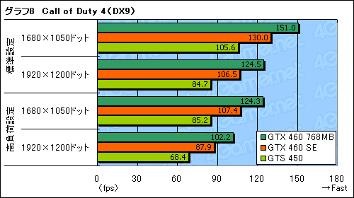 グラフ8に示した「Call of Duty 4: Modern Warfare」(以下,Call of Duty 4)だと,GTX 460 SEのスコアは対GTX 460 768MB比86%前後と,あまり芳しくない。グラフィックス描画負荷の低いCall of Duty 4のようなタイトルでは,CUDA Core数(≒テクスチャユニット数)とGPUの動作クロックがそのままスコアに影響を及ぼしているということなのだろう。