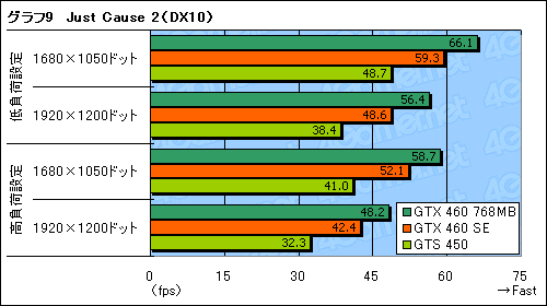 メモリ周りの性能がスコアを左右しやすい「Just Cause 2」の結果がグラフ9だが,ここでもGTX 460 SEとGTX 460 768MBの力関係は3DMark06やBFBC2と同じだ。描画負荷が高くなるテスト条件でGTX 460 768MBとの差を詰めるものの,それでもスコアは1割以上低い。