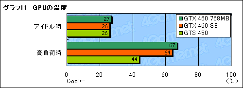 最後に,室温20℃の環境でバラックにシステムを置き,GPU-ZからGPU温度を取得した結果をお伝えしたい。ここではアイドル時に加えて,3DMark06を30分間連続実行したときを「高負荷時」として,それぞれの時点における温度をスコアとして取得し,グラフ11にまとめているが,同じカードデザイン,同じGPUクーラーを採用することもあって,GPU温度もGTX 460 SEとGTX 460 768MBで大差がなかった。