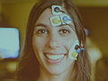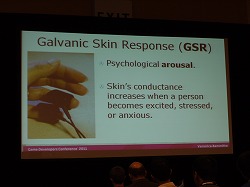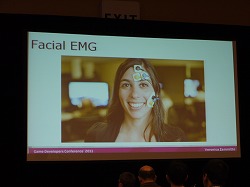 最後に,バイオメトリクスについて説明しよう。これは被験者の薬指と小指にセンサーを接続し,プレイ中の体温の変化や汗の量を記録したり,顔に取り付けたセンサーで筋肉の動きを見るというものだ。これらを測定することによって,プレイ中のどんな場面で緊張し,どこで興奮するかどうかなどがデータとして分かるのだという。