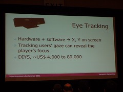 これはWebサイトのユーザービリティテストなどでも使われている手法なのだが,特殊な装置を用いて,被験者の視線の動きを記録するというもの。ゲームを遊んでいる人の視線を追うことで,実際になにを見ているのか,ゲームのどこに集中しているのかが分かるという。