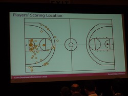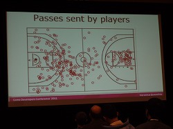 今回のレクチャーで紹介された「NBA Live 10」(PS3 / Xbox360 / PSP)の事例だと,ボールを持っているキャラクターではなく,ベンチの脇にいるコーチに視線を多く向けている人がいたそうだ。バスケットボールのゲームで,試合に関係ない部分をよく見ている状況というのは,当たり前だがよくない傾向だ。なんらかの要因でゲームに集中できていない可能性もある。
