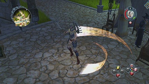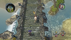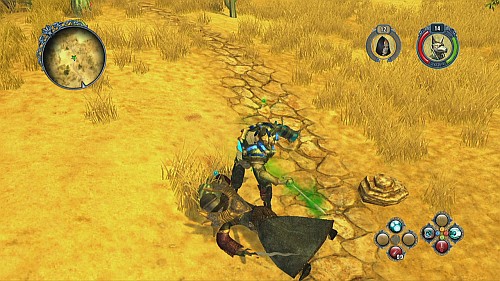 本作では基本的に,自分の向いている方向を攻撃する。魔法や弓矢などの遠距離攻撃では,キャラクターの視線の延長上にいる敵をターゲッティングするようになっている。たとえば,自分の後ろに雑魚がいて,遠距離に厄介な敵を見つけたときは,雑魚に殴られるのを我慢して視線を厄介な相手に向ければ,その敵に向かって遠距離攻撃が繰り出せる。一部例外はあるが,スキルを上げまくると,ホーミング性能が付いたりもするので,操作で困ることはないだろう。ハイエルフのファイヤーボールに至っては,ロックオンしたら90度どころではないまがり方をする。