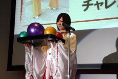 ![]() グランプリを決める競技は,風船を載せたお盆を目線の高さまで掲げて移動するというもの。巫女さん風の競技で争った |