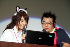 ゲームの概要が簡単に紹介されたあと,ステージ上では,御藝巫女の東さんが里吉氏のレクチャーに従って,実際に大戦略WEBのチュートリアル部分をプレイ。「思ったよりも簡単。これなら誰でもできそう」と,同タイトルの手軽さをアピールした。