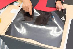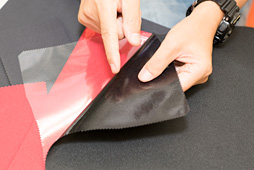 (製造法は)ゴムをところてんみたいにズラーッて出すのね。それは出てきたときに熱を持ってるんだけど,その上下に布を置くわけ。すると付着するんだけど,そこで裏側をバリバリと剥がすと,それが“裏面の加工”になる。