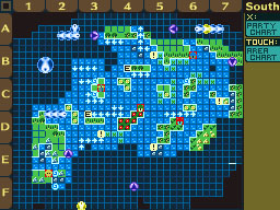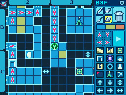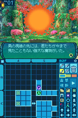 歩いたグリッドは自動的に着色されていくので,半分はオートマッピングだが,壁や扉,特殊なイベントが発生する場所などについてはタッチパネルを使って地図に直接書き込んでいく(オブジェクトを配置する)ことになる。このため,プレイヤーによって完成した地図が微妙に違ったりもする。