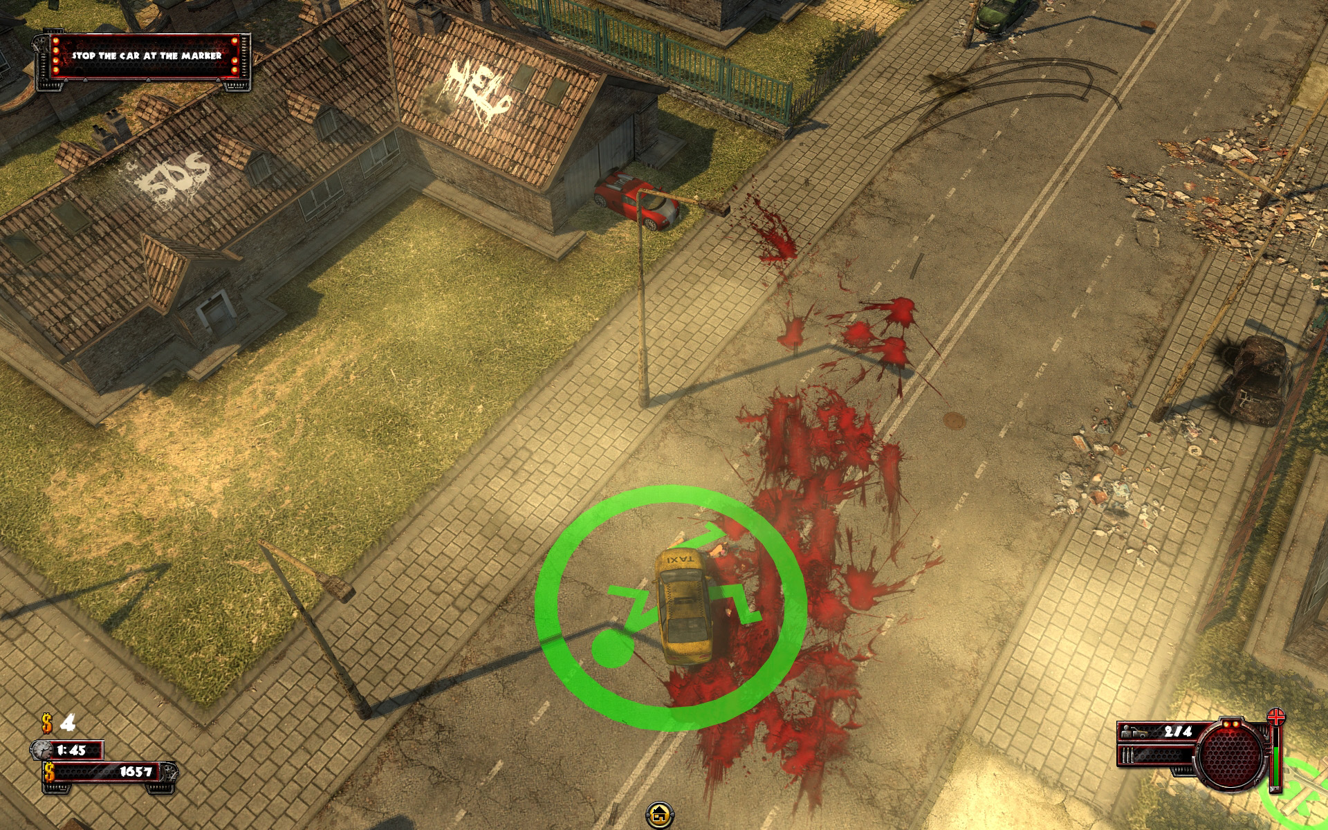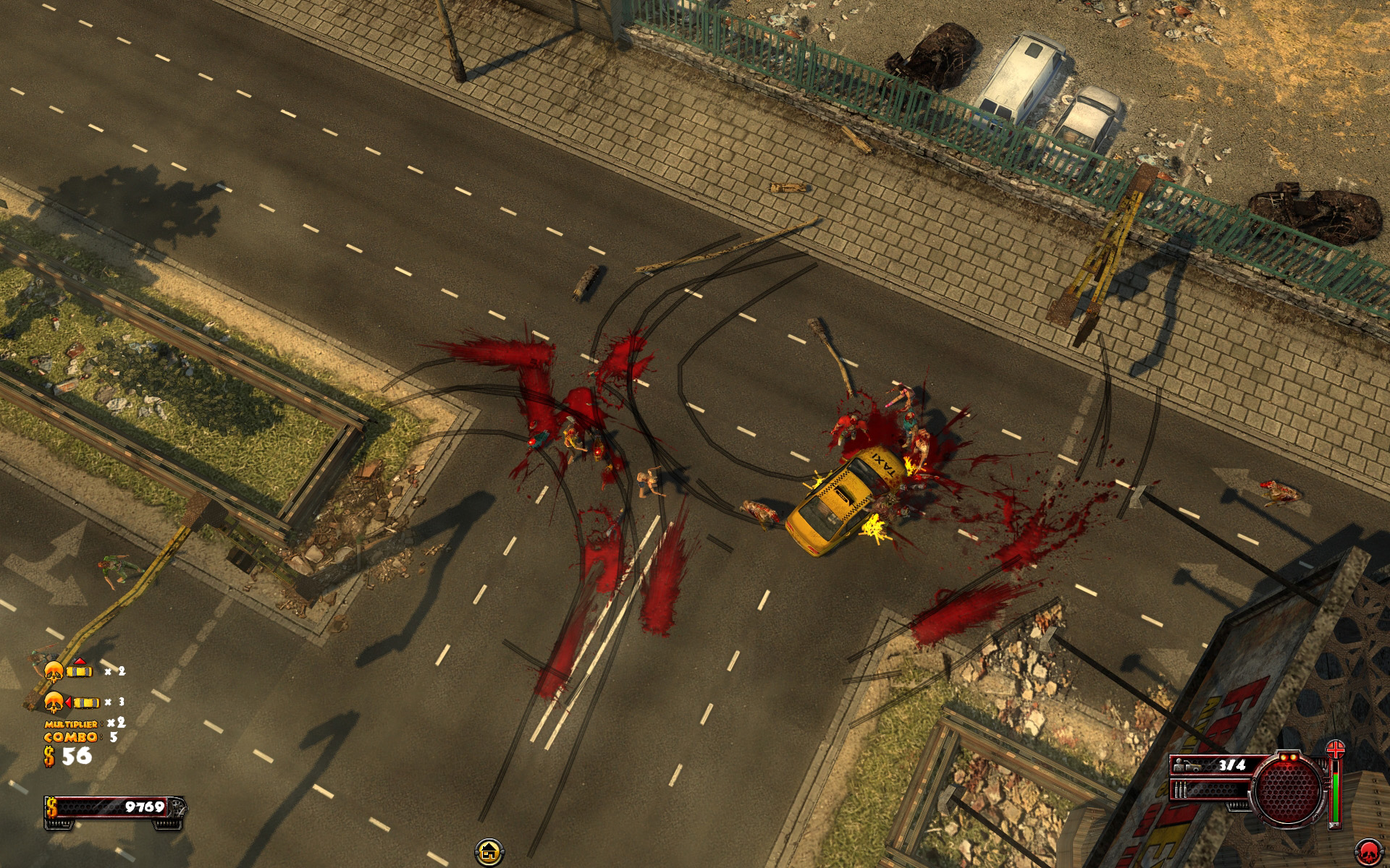 本作の気持ち良い部分となっているのが,誰がなんといおうとゾンビを轢いたときのグチャグチャ感だ。ゾンビがバラバラに飛び散ったり,血が吹き出て路面に生々しい血痕が残ったりしてスゴい。また,連続して轢いたときには「グチャグチャ」系の心地良い音が奏でられてボクちゃんカ・イ・カ・ン。なんだかとんでもないことを書いているような気がしてきたが,これがZombie Driverの楽しさであり,正しい楽しみ方だ。