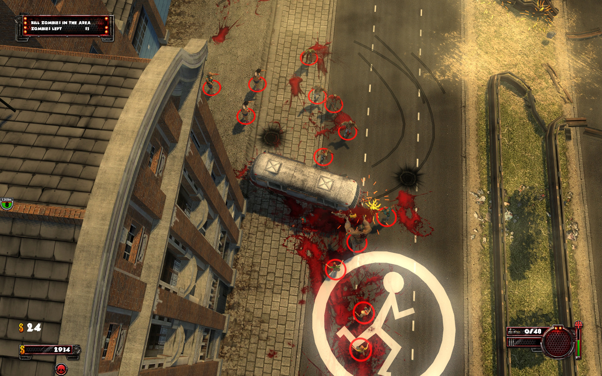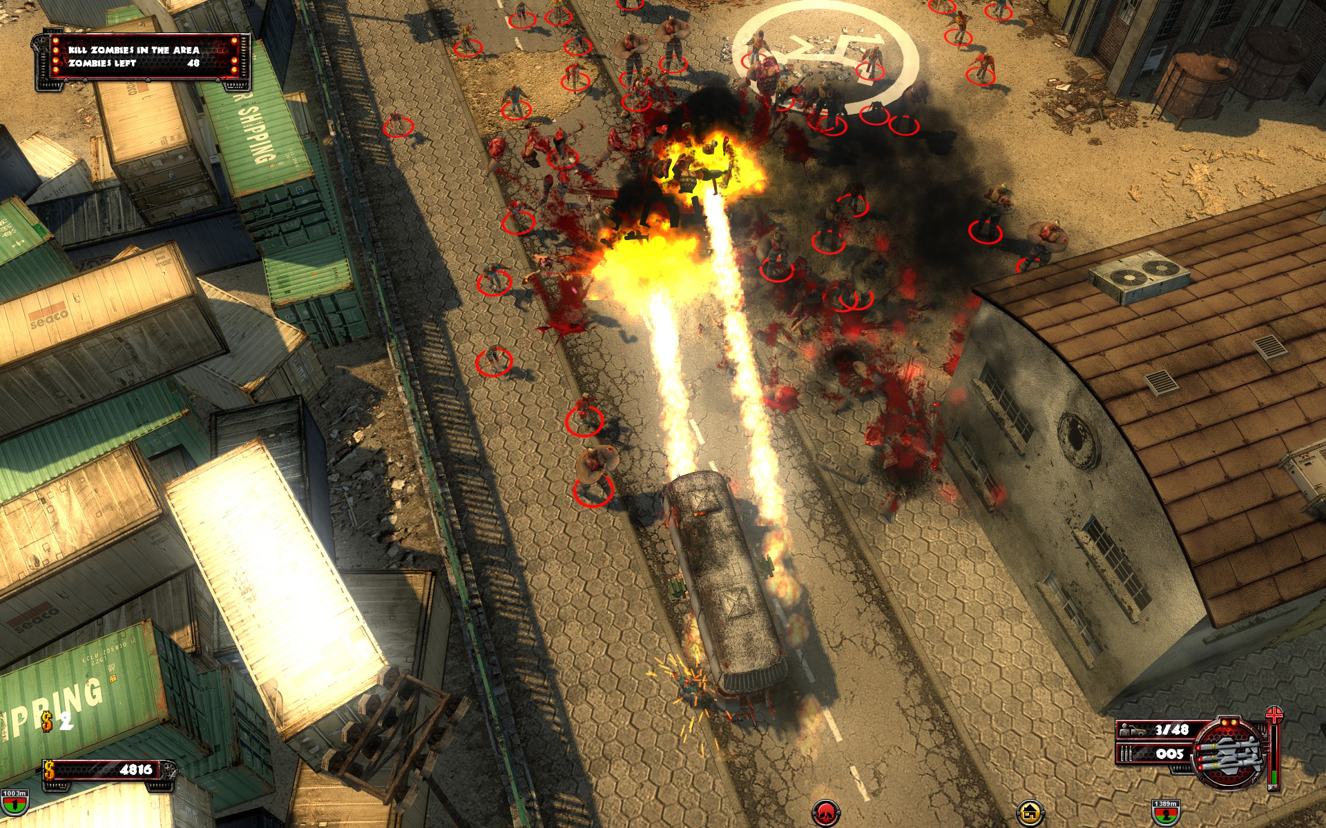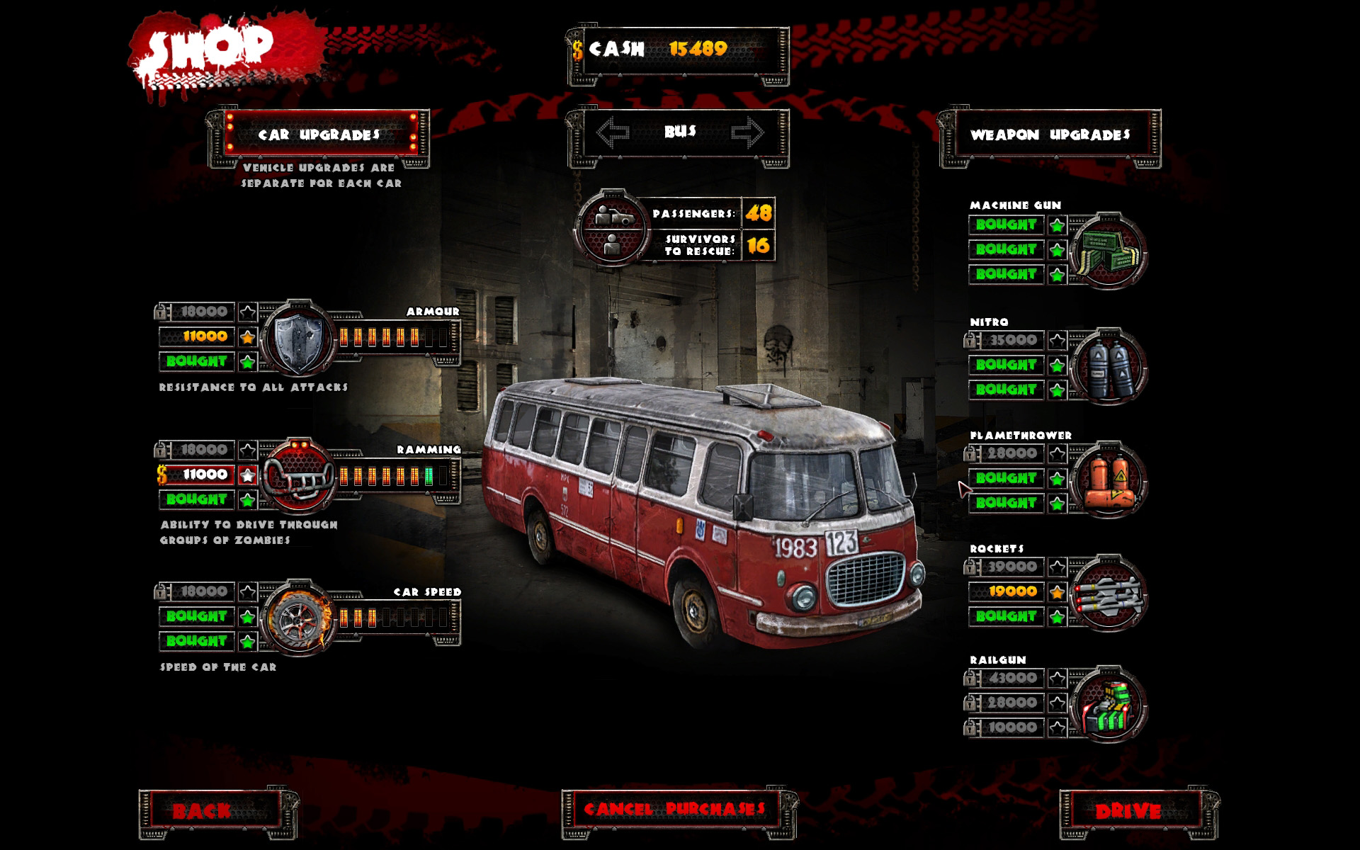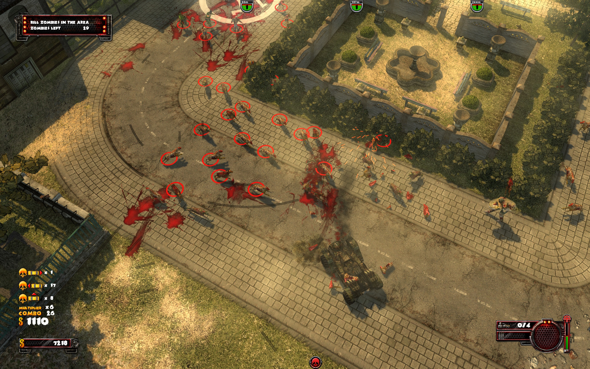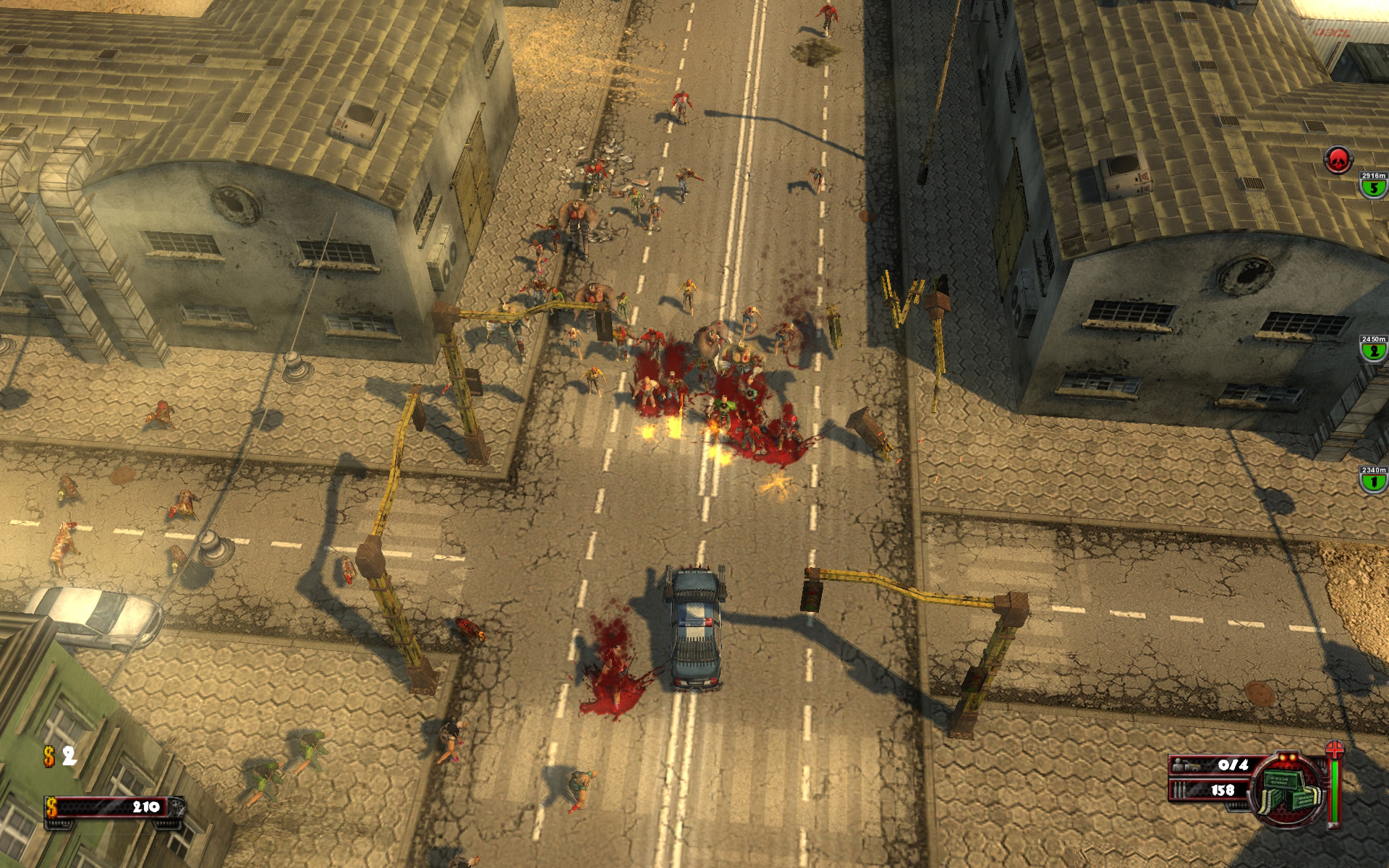 ゾンビ達を轢いたり武器で倒したりすると報酬が入り,連続して倒せばコンボボーナスでより多くの報酬を入手できるから,大量のゾンビを見かけたら突進だ。