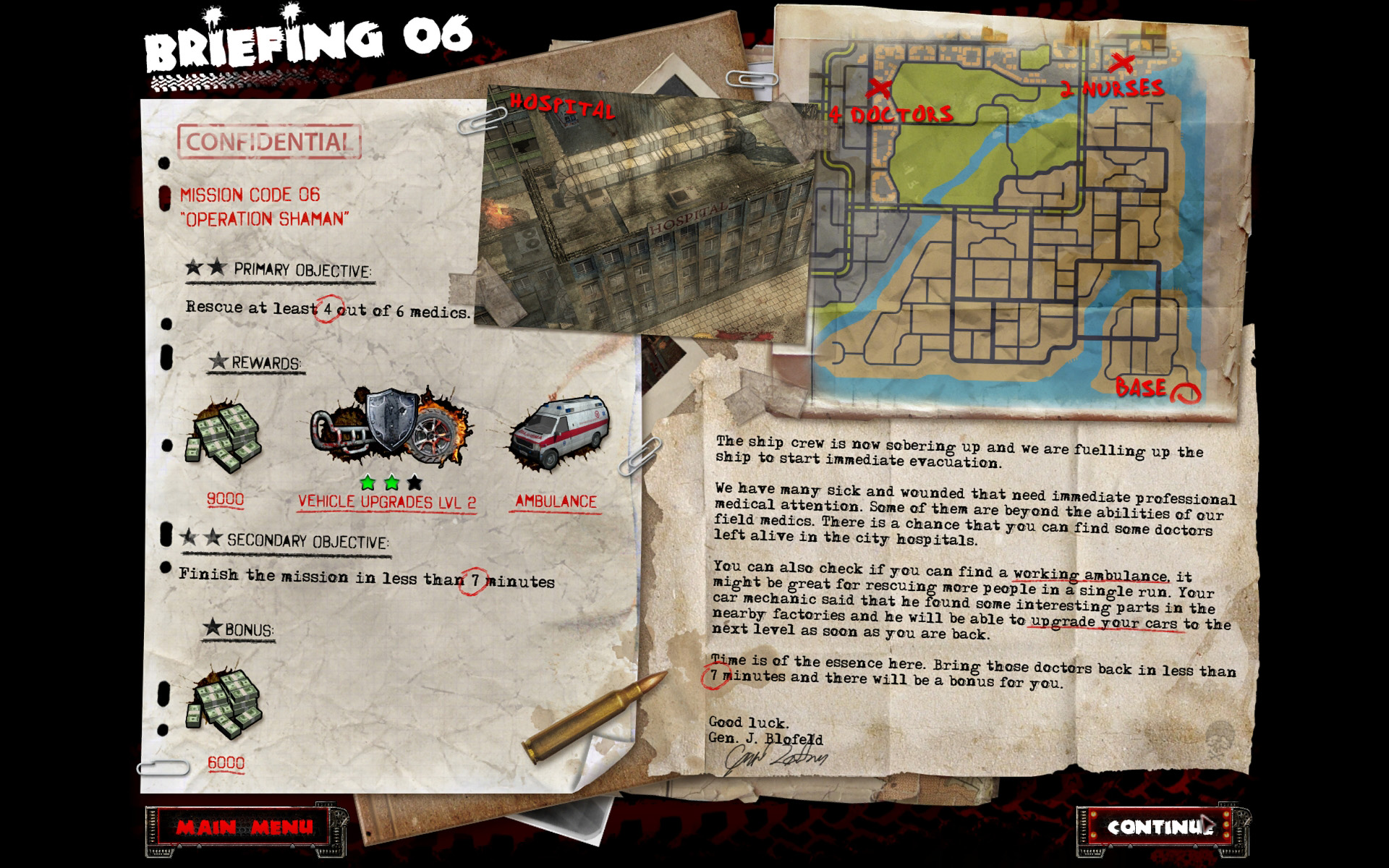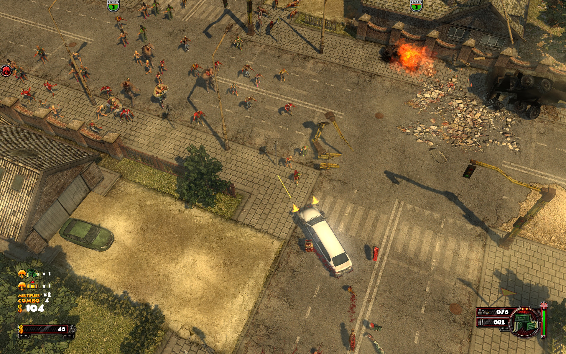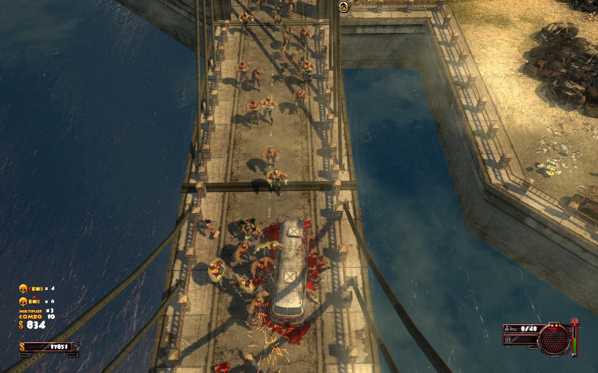 巨大な都市で発生した悲惨な科学事故により,人口の大部分は死に絶えてゾンビになった。ゾンビ達は新鮮な脳ミソを求めて都市の中をさまよい歩いており,わずかに残った生存者達は建物に籠城して助けを待っている。キミは武装した車をぶっ飛ばし,生存者の救出に向かうのだ! 行け! というお話。たぶん速攻で忘れても大丈夫。