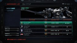 エントリーしている傭兵リストの中から,どの傭兵を雇うか選択する。傭兵ランク,依頼額,戦闘タイプ,アセンブルなどを見ながら,自分のチームに必要だと思う傭兵を雇おう。 |