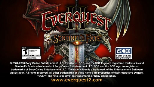 (c) 2004-2010 Sony Online Entertainment LLC. EverQuest is a registered trademark and Sentinel's Fate is a trademark of Sony Online Entertainment LLC. SOE and the SOE logo are registered trademarks of Sony Online Entertainment LLC. The software platform logo (TM and (c)) IEMA 2004. The ratings icon is a trademark of the Entertainment Software Association. All rights reserved. All other trademarks or trade names are properties of their respective owners.