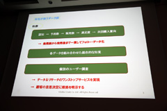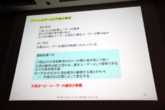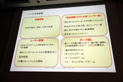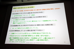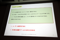 さらに,「ソーシャルゲームにお金を使う人の割合は20%近くいてびっくりしたが,多くのお金を使う人は一握り。そして,お金を払うプレイヤーには,コンシューマゲームファンとの相関性が見受けられた」「ソーシャルゲームにお金を使って遊んでいる層の中には,もともとコンシューマゲームを遊んでいたが,引退してしまったという層が多く存在する」と語るなど,昨今話題のソーシャルゲーム市場が,決して無限に広がる未開拓のフロンティアというわけではなく,連綿と続いてきたゲーム市場/ゲーム文化の中の一分野でしかないという主旨の話をしてきたことは,とても興味深い。