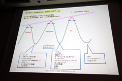 余談だが,最後の指摘は一見ありふれた話に思えるのだが,細川氏は,携帯ゲーム機(専用機か,スマートフォンのような複合機かは分からないとしているが)へのシフトが「世界規模で進んでいく」と見ている。つまりその結果として,資本力と技術力勝負の重厚長大な開発スタイルから,アイデア勝負の小回りが効く市場へと立ち戻る可能性を示唆しているようにも感じられた。それが日本のゲーム業界にとって吉と出るか凶と出るかは分からないが,一つの可能性という意味では,現時点で留意しておく価値のある分析だろう。