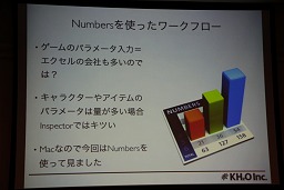 続いて,KH2Oの大前氏が登壇し,Unityを使ううえでのTipsのような感じで,Mac上の表計算ソフトで管理されたデータ表をAppleScriptなどを使ってUnityのプロジェクトに流し込み,一気にビルドを行うといったデモを披露。そのほか,Unityは文字描画周りが弱いので,表計算ソフト上のテキストをiPhone上で画像に加工して取り込むという実演も行い,Unityの機能を拡張していくことで,非常に便利な環境が作れることを示していた。
