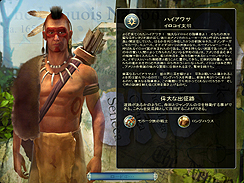 ![]() ・指導者:ハイアワサ ・文明固有の能力「偉大なる出征路」:森林とジャングルが道路扱い。交易路にもなる ・ユニークユニット:モホーク族の戦士,ロングハウス |