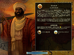 ![]() ・指導者:アスキア ・文明固有の能力「水軍の将」:蛮族の野営地や都市略奪で得られるゴールドが3倍になる。また,海に出た陸上ユニットが自衛可能 ・ユニークユニット:イスラム騎兵隊,泥のピラミッド状モスク |