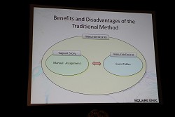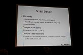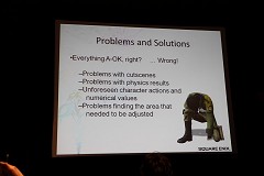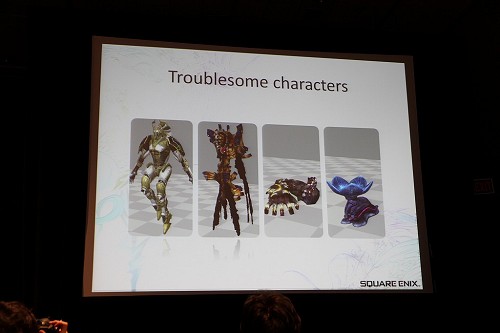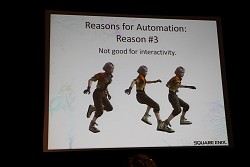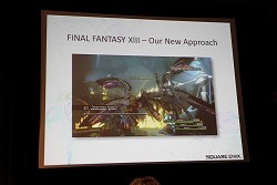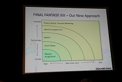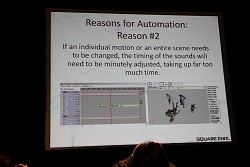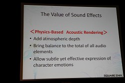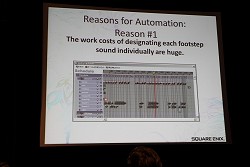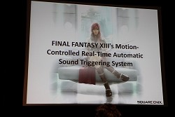 なかでも今回レポートするセッションは,主にサウンド周りにフォーカスが当てられた内容で,その名も「FINAL FANTASY XIII's Motion-Controlled Real-Time Automatic Sound Triggering System」というものだ。戦闘シーンでの斬撃音や魔法といった,ゲーム中で発生する各種効果音,カットシーン(ムービーシーン)におけるキャラクターの挙動音(足音など)の発生(指定)などを,モーションやコリジョンの判定によって自動的に行ってしまう技術の解説である。