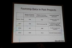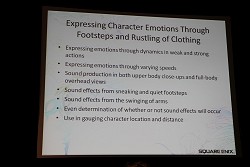 さて,今回の講演は,どちらかというとサウンド制作におけるシステマティックな話が中心だったわけだが,個人的には,矢島氏が「足音でキャラクターを表現する場合に〜」という発言がとても印象的であった。