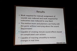 ともあれ,そうした試行錯誤を繰り返しながらFF13のサウンド制作は終了。土田氏は「今回は,システムをゼロから構築することになったので大変だったが,次の作品からは,FF13で培ったデータ/テンプレートを応用できる。よりブラッシュアップしていくことで,理想的なゲームサウンドを低コストで作れるようになるはずだ」として,今回の講演を締めくくった。
