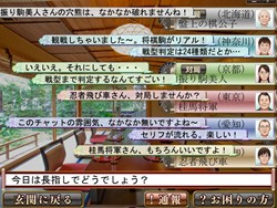 談話室では,実際の公式大会の談話室で,それぞれが戦型について語っている雰囲気をイメージしたような,一風変わった画面でチャットが行える。