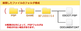 展開したファイルのフォルダ構成は、下記のようになります。環境により、PSPフォルダが作成されない場合がありますので、作成されなかった場合はPSPフォルダを作成し、下記の構成になるようにファイルを移動して下さい。