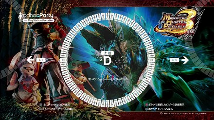 トップ画面 MHP 3rd 特別仕様にデザインされたトップ画面をご利用いただけます。従来の「アドホック・パーティー for PlayStation(R)Portable」と切り替えてご使用いただくことが可能です。