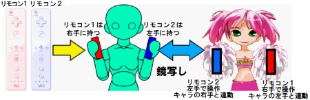 赤は右手用(Wiiリモコン1),青は左手用(Wiiリモコン2)です。