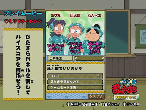 プレイムービーでは,指定された課題に沿って,下から競りあがってくるパネルで画面が埋まらないように,どんどん消してハイスコアを目指す「ひとりでチャレンジ」や,先生から出される課題に挑戦する「先生にチャレンジ」,ほかの忍たまキャラクターから次々に出される課題をクリアしていく「みんなにチャレンジ」といったゲームモードを見ることができる。